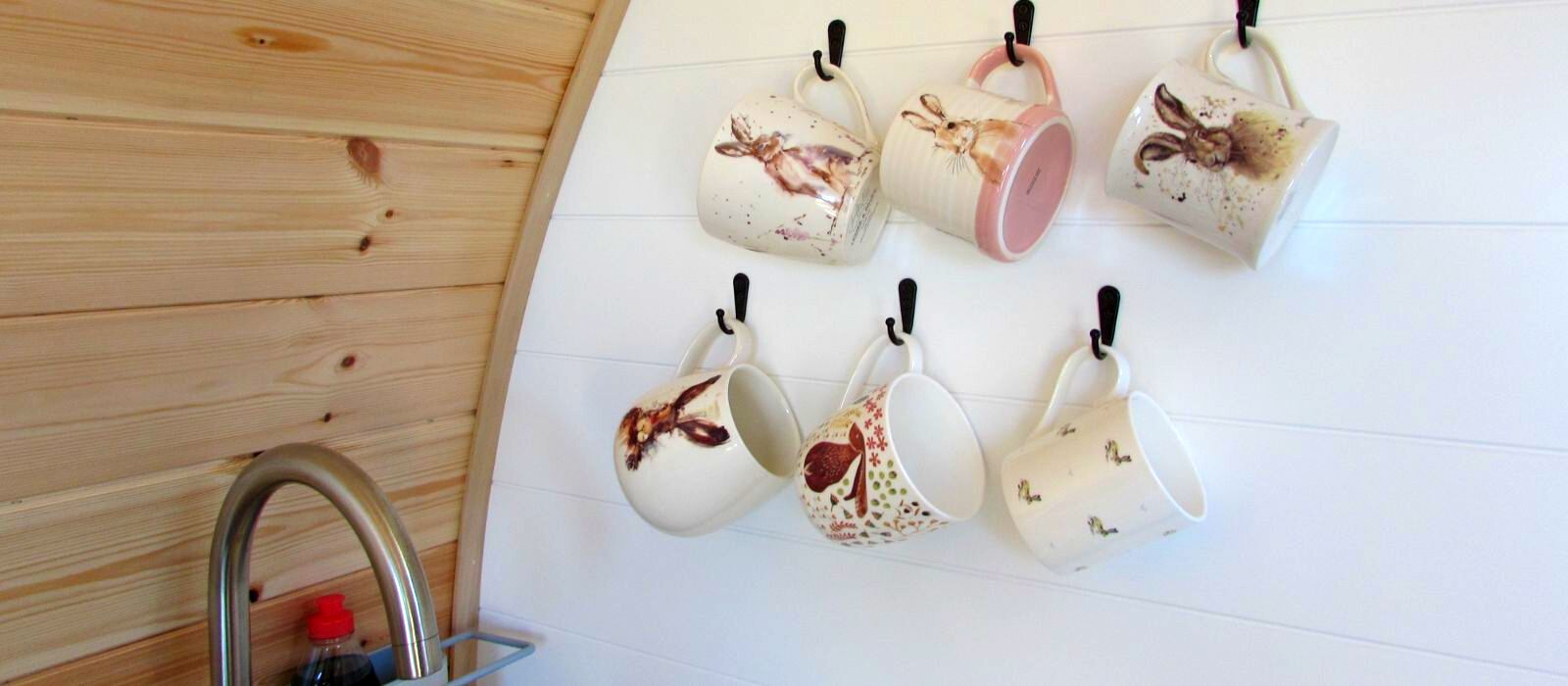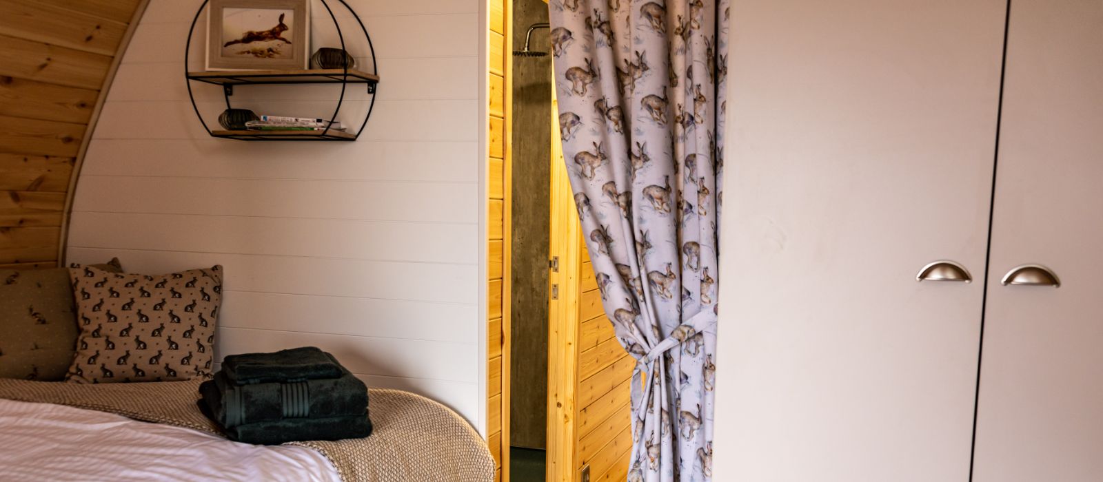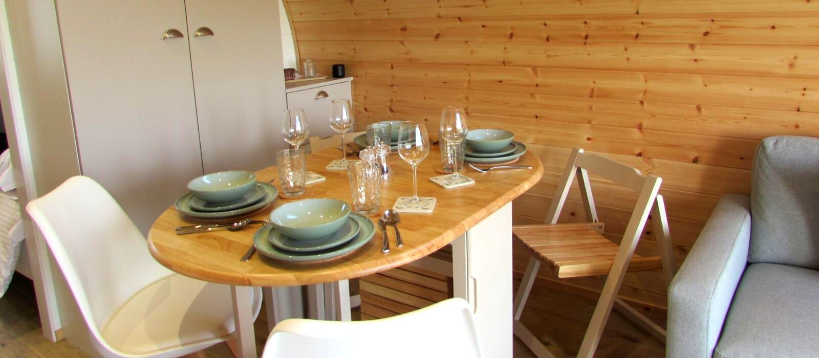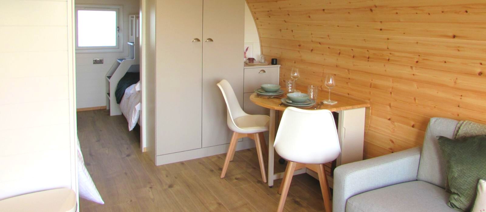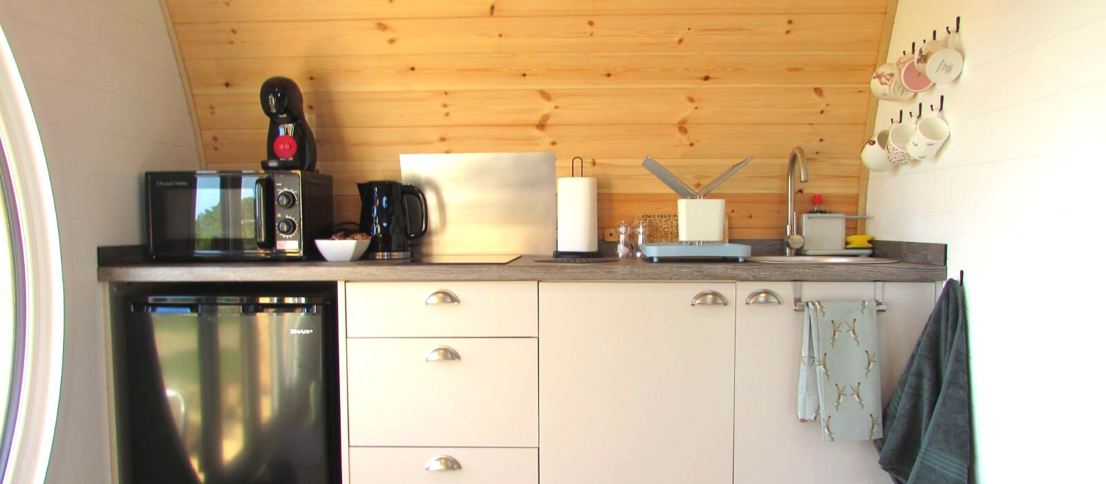 Fully insulated and with underfloor heating, our pods are perfect for year-round glamping. The lounge area has a comfortable sofa, extendable dining table and chairs and a wall mounted Smart TV. The fitted kitchenette includes a ceramic hob, fridge with ice compartment, microwave, kettle, coffee maker, toaster and a range of crockery, glassware and pans.